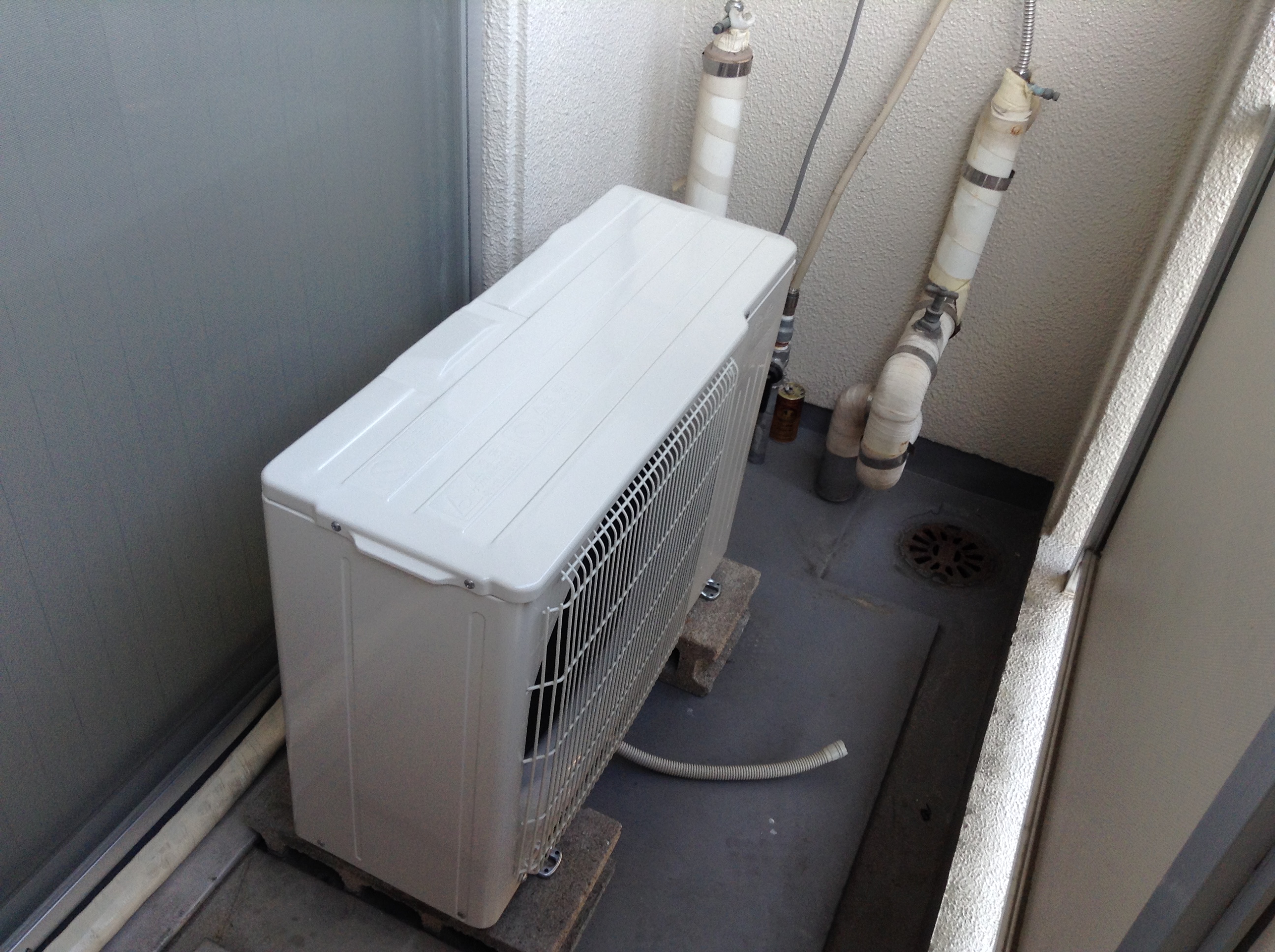 室内機の下に室外機を置くと隣の部屋との避難経路を塞いでしまうので、万が一の時を考慮して室外機は室内機と対称にベランダの反対側に置きました。